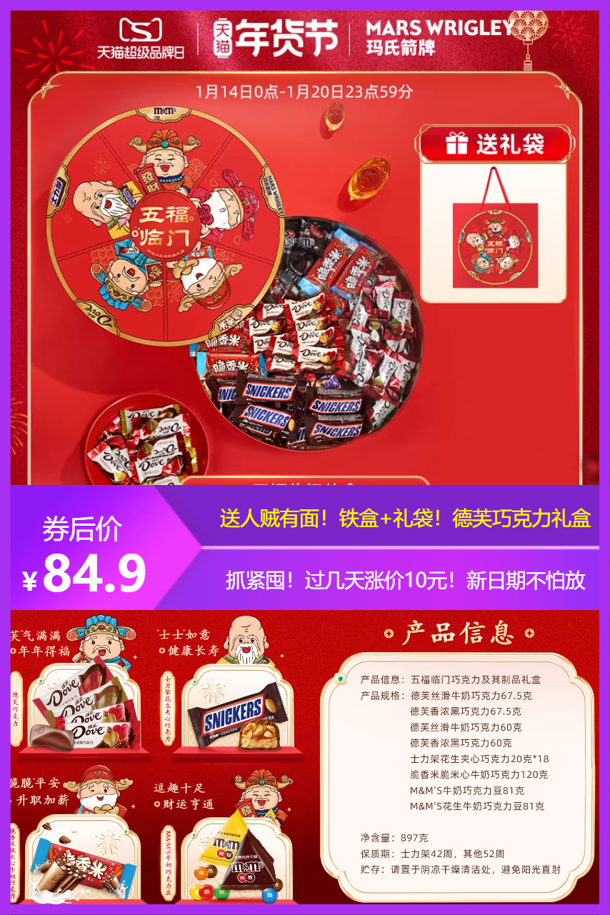 这个送人超有面子!德芙牛奶巧克力15包+德芙黑巧15包+德芙喜糖10包+德芙香浓黑巧10包+士力架18包+脆香米10包+M豆牛奶6袋+M豆花生6包!礼盒+礼袋新日期抓紧囤!后面必涨价