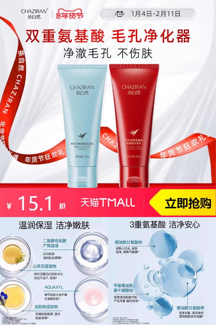 【淘金币抵3.85,学生立减3,其他红包0.37,最终到手7.88】茶自然二列酵母氨基酸洗面奶,男女皆宜!氨基酸配方温和亲肤,敏感肌也能安心用。二列酵母助力焕活肌肤,深层清洁毛孔污垢、彩妆残留,同时补水保湿,洗后不紧绷。一瓶满足多样肤质需求,开启肌肤净润新体验!