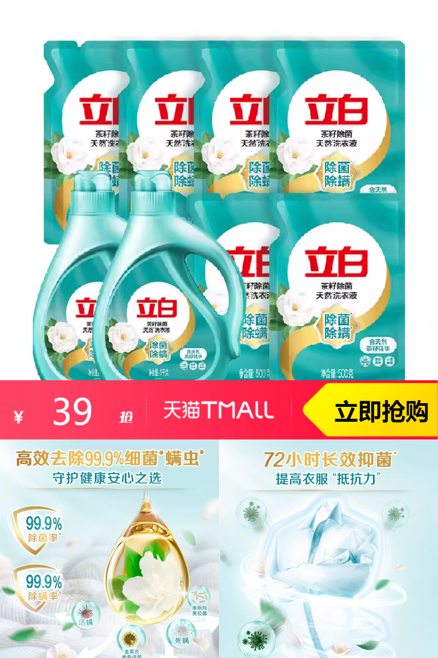 【1、淘金币抵扣3.52 2、猫超首页领20-3闪购红包 3、天猫超市搜"立白"领品牌金5块 4、猫超价到礼金4.4 5、最终到手23 到手10斤!】家庭洗衣好帮手,清洁又健康,选立白洗衣液,茶籽配方,深层除菌。
