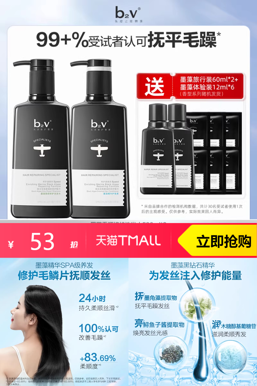 【淘金币抵扣13.45元,9.6折无门槛限时折扣券减2.12元,凑单200-25元消费券减4.6元,到手价32.83元】超火爆的b2v墨藻洗发水来啦!众多明星网红自用推荐!针对不同受损发质,像护肤一样护理头发!b2v你的头发修护管家!