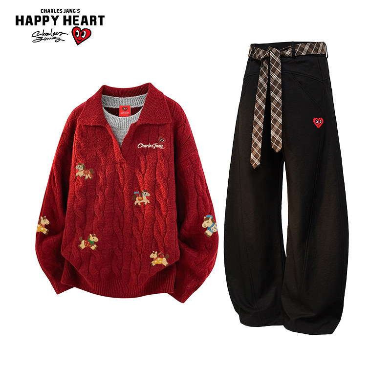 推荐:查尔斯桃心休闲套装男冬季新款保暖假两件毛衣宽松加绒加厚弯刀裤