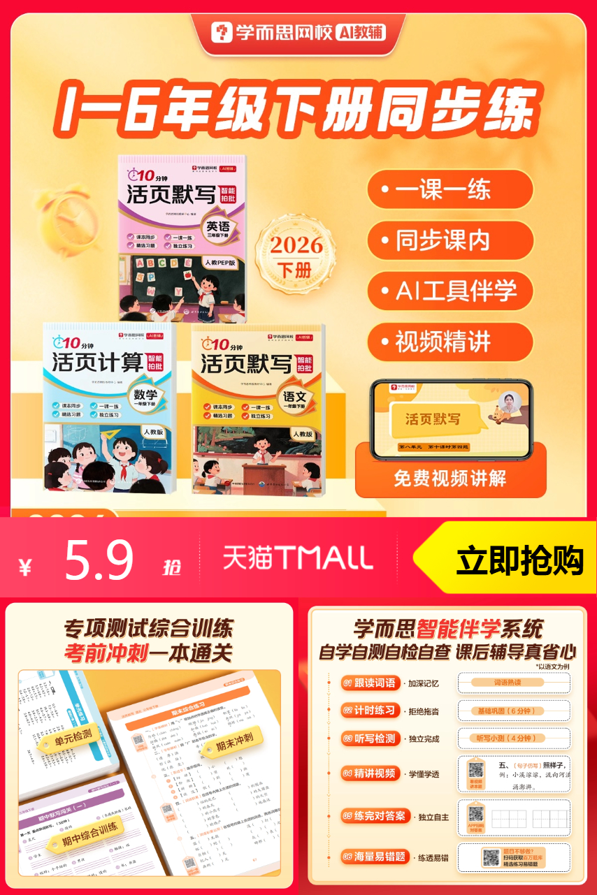 【叠加天降红包价淘金币0.39元3.51元】学而思26新版下册10分钟活页,小学1-6年级语数英任选,方便练习,高效巩固知识点!
