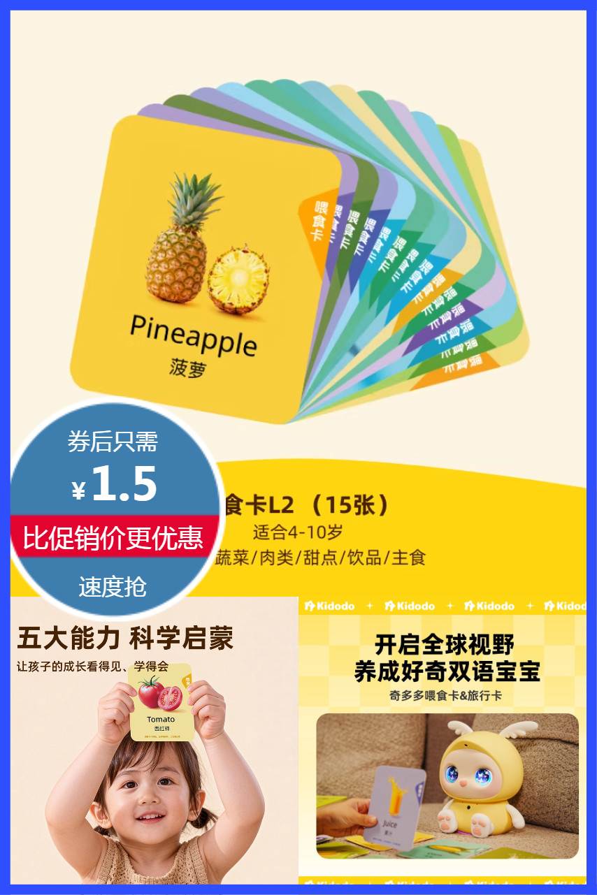 立减8.4元叠加劵到手1.5元!奇多多星球双语早教卡喂食卡15张,认知启蒙,思维训练,专注力培养,语言发展,丰富想象力,植物大豆油墨,环保健康,宝宝安心用!