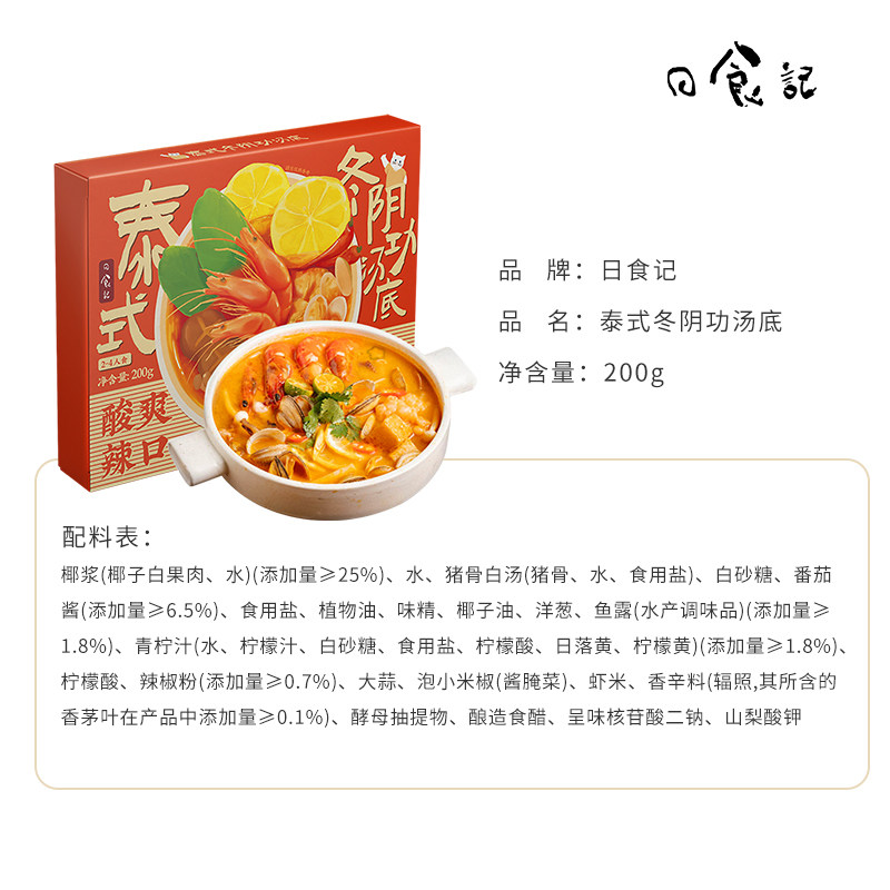 这款日食记的泰式冬阴功汤料包火锅底料,采用新鲜食材制作,味道鲜美,酸辣适中,适合各种口味的人群食用。同时,它还具有丰富的香味,可以为您的火锅增添一份独特的风味。无论是自己在家做火锅还是在餐厅享用,都能让您享受到美味的口感。