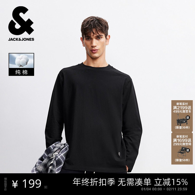 推荐:【纯棉打底T恤衫】杰克琼斯男装春新款纯色圆领宽松长袖刺绣上衣