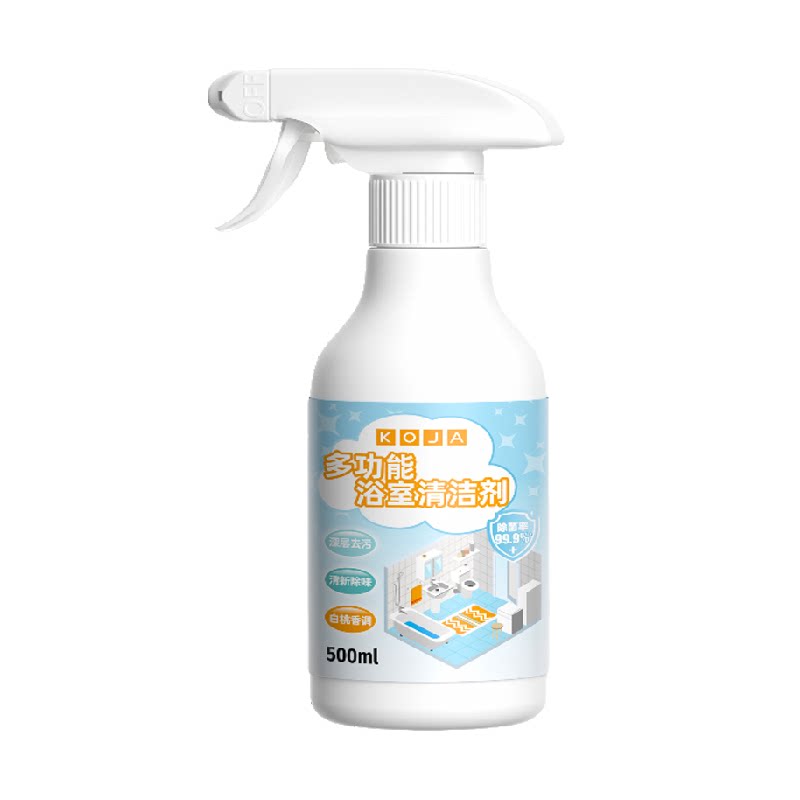 KOJA浴室多功能清洁剂是一款专为浴室设计的清洁剂,适用于各种表面如浴缸、马桶、淋浴间等,有效去除污渍、水垢和细菌,保持浴室清洁卫生。500ml容量,方便携带,随时随地清洁浴室。