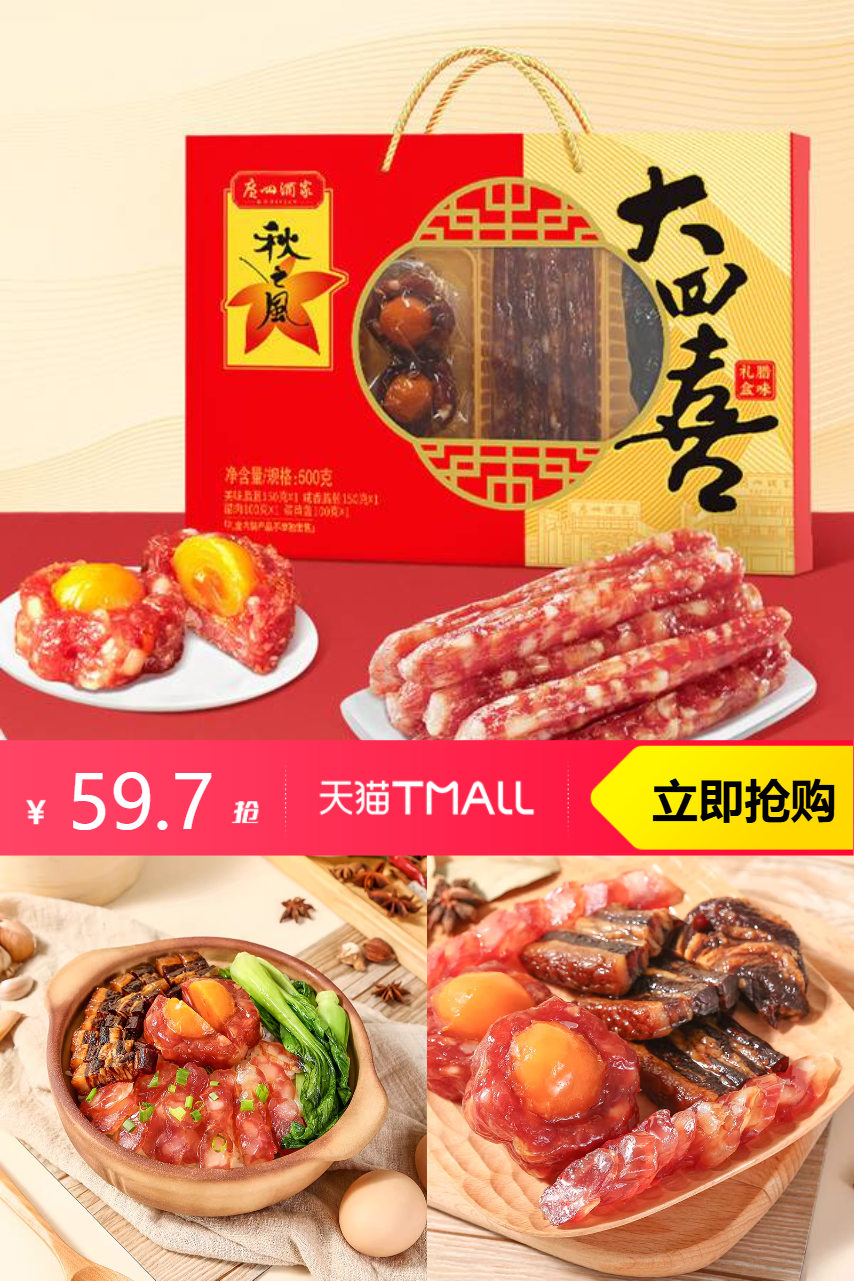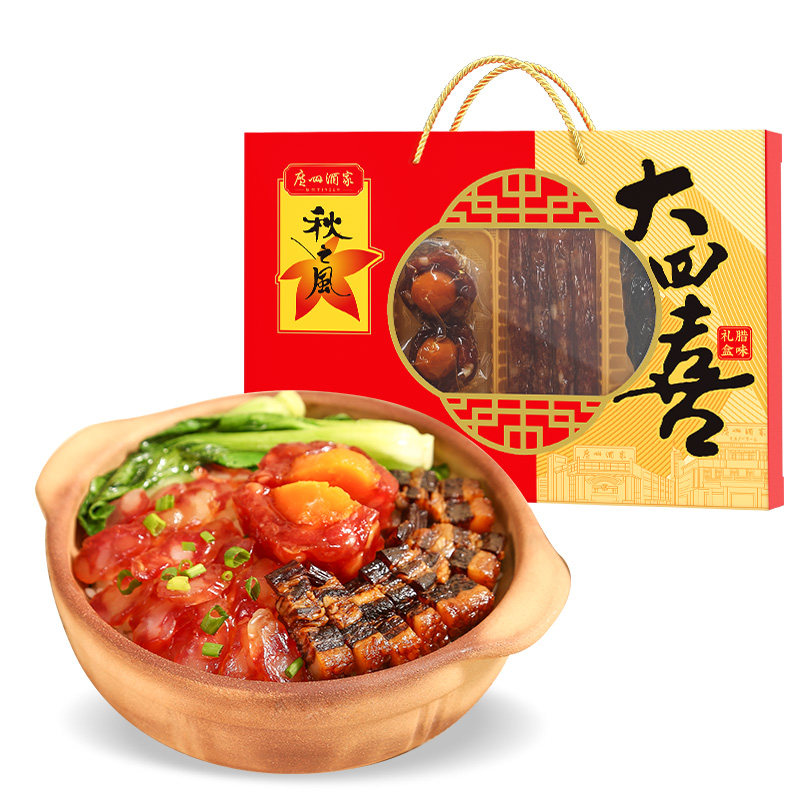 【官方立减22.3,淘金币抵扣1.78,凑消费券200-25,到手50.68】叠淘金币2.59+凑消费券后到手54.64元,大四喜腊味礼盒500g, 广州酒家大四喜腊味礼盒广式腊肠香肠腊肉煲仔饭新年年货送礼团购