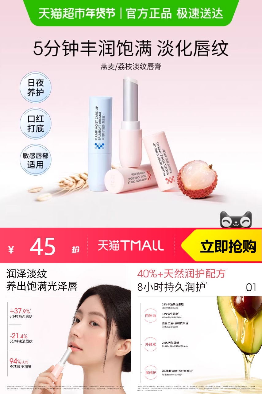 【原价69-官方立减24-店铺券2-88vip减2.15-淘金币4.57-消费券4.4=到手价31.88元】ddg燕麦荔枝淡纹润唇膏保湿3.2g,品质优选~