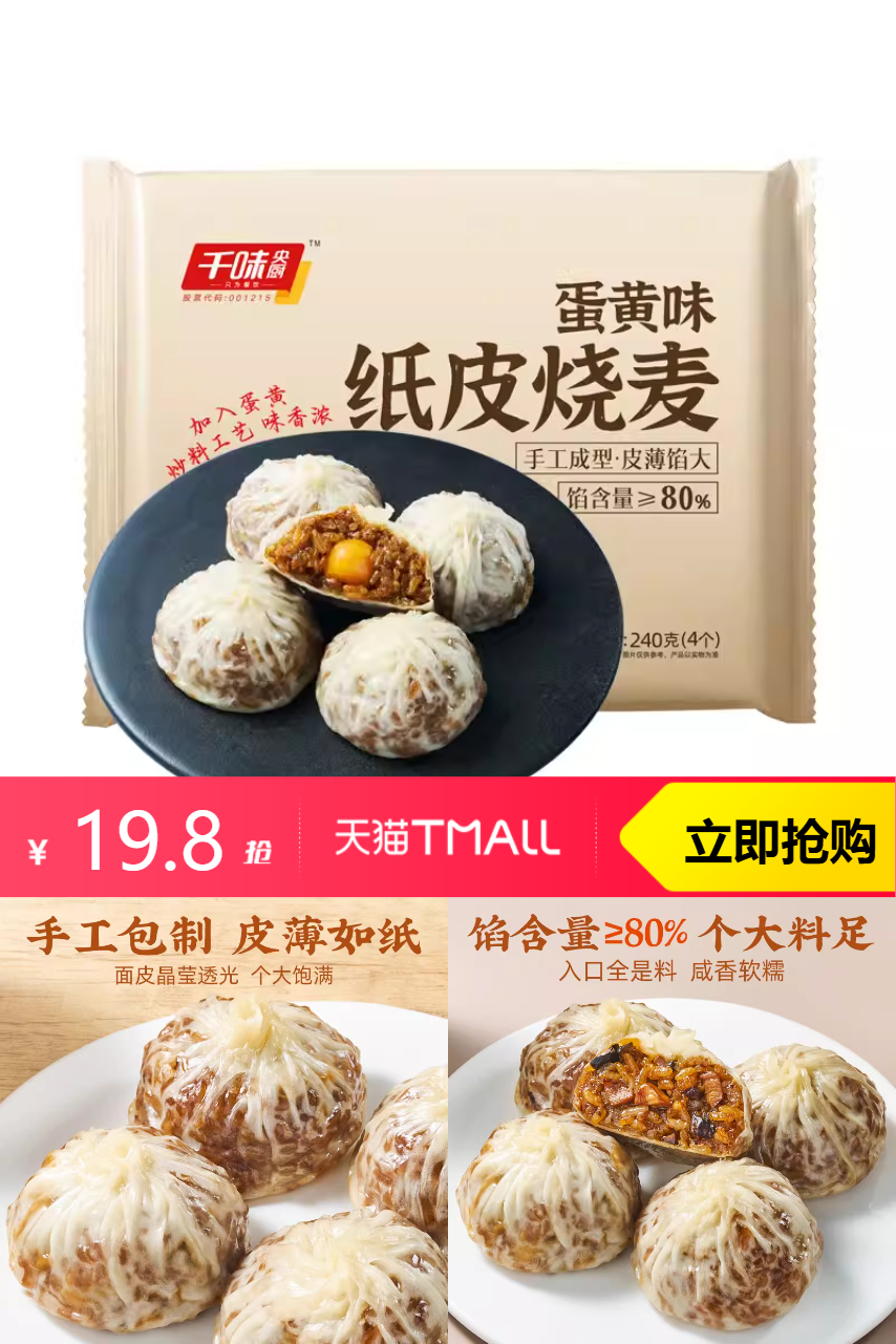 【淘金币抵扣0.38 到手19.42】【任选4】千味央厨蛋黄纸皮烧麦早餐半成品,真正的央厨出品•纸皮烧麦!正宗茶楼纸皮烧麦,薄皮糯馅、满口鲜香!蒸5分钟即享热乎早餐,比外卖干净,比茶楼便宜
