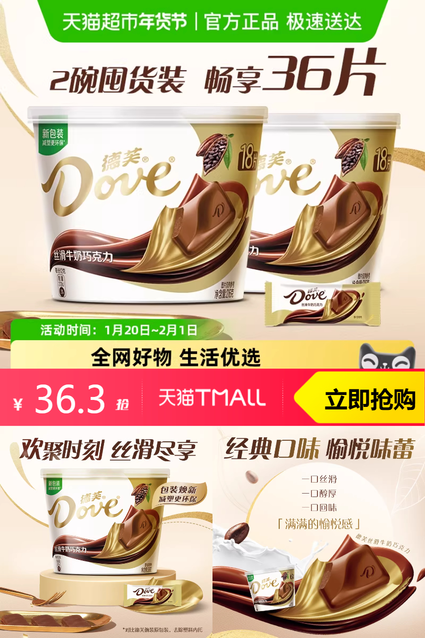 【淘金币6.68,淘礼金5.09,红包3元,凑单到手36元,折合18元/件】德芙全家福巧克力216g*2。精选优质可可,匠心制作,口感醇厚丝滑。限时优惠,数量有限,爱吃巧克力的你千万别错过这波超值福利!