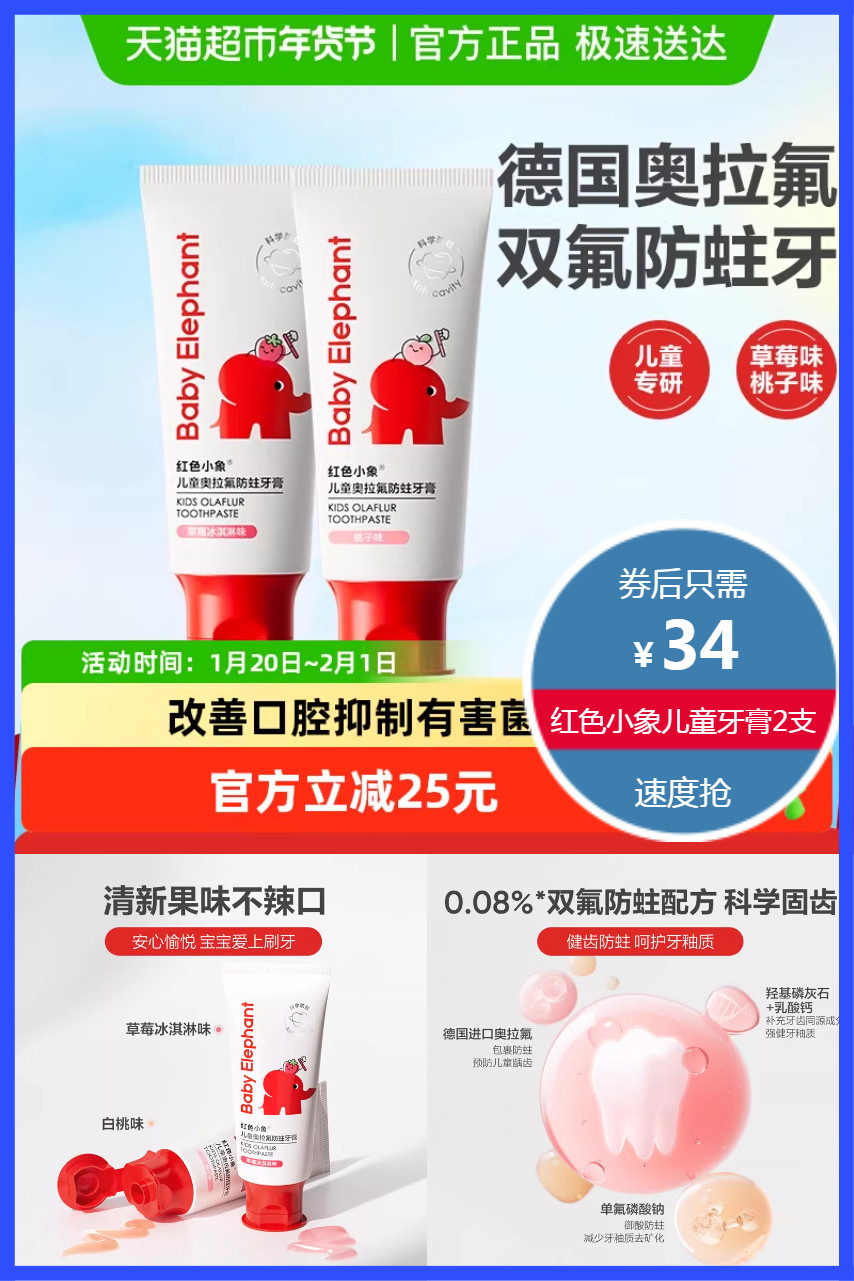 立减25元+88会员+福利包2元叠加劵到手30.3元!红色小象儿童奥拉氟牙膏2支,双氟防蛀护齿,温和低泡洁净,德国进口奥拉氟,包裹防蛀,预防儿童龋齿,羟基磷灰石+乳酸钙,强健牙釉质,温和去除牙垢残渣,清新果味不辣口