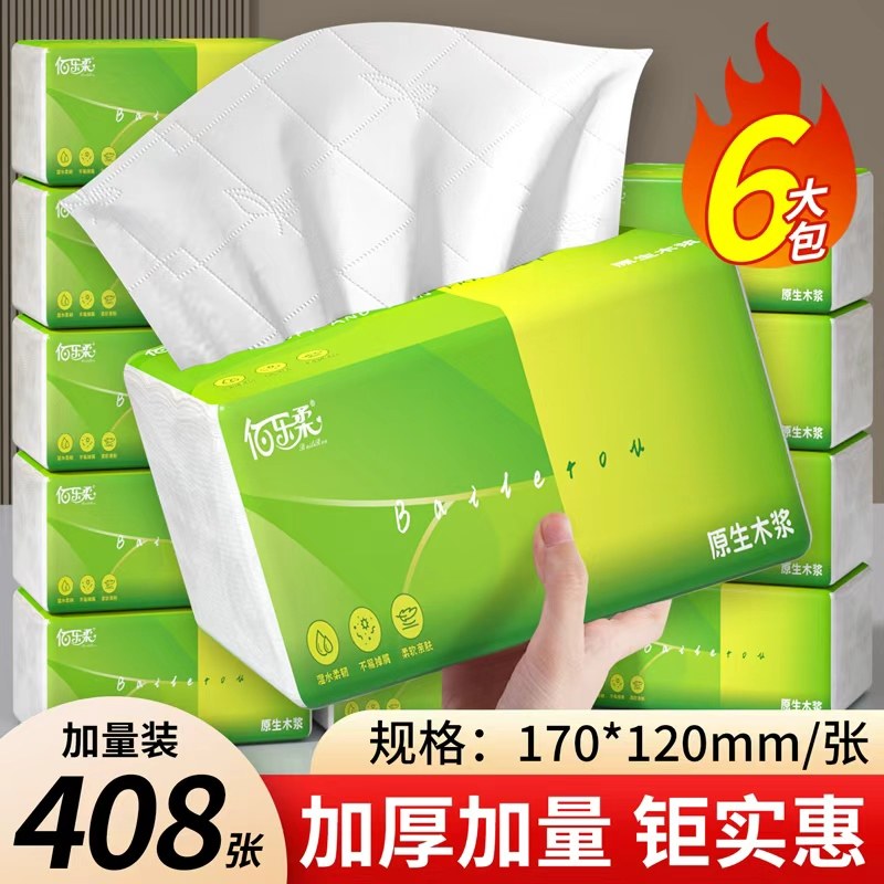推荐:6大包408张大包纸巾抽纸餐巾纸家用实惠装卫生纸擦手纸家庭装加厚