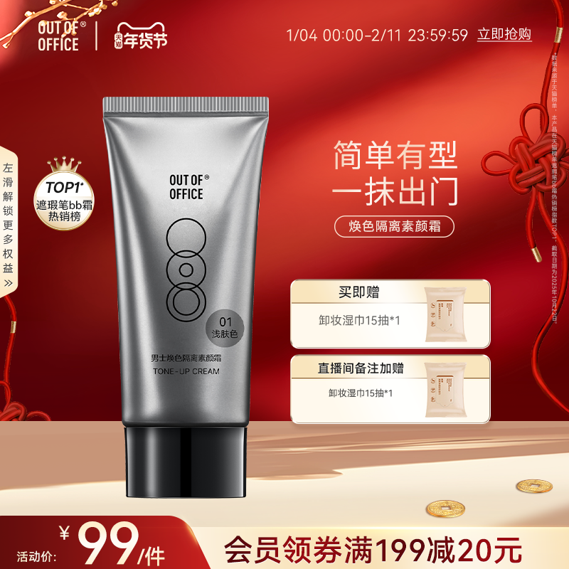 【年货节】OUT OF OFFICE素颜霜面部隔离霜OOO男士底妆提亮自然色。这款男士专用的隔离霜,能够提供持久的保护,让肌肤保持水润光泽。它采用天然植物成分,不含任何化学物质,温和安全,适合敏感肌使用。同时,它的质地轻薄,容易推开,不会留下厚重感。无论你是学生党还是上班族,都能轻松驾驭。快来体验吧!