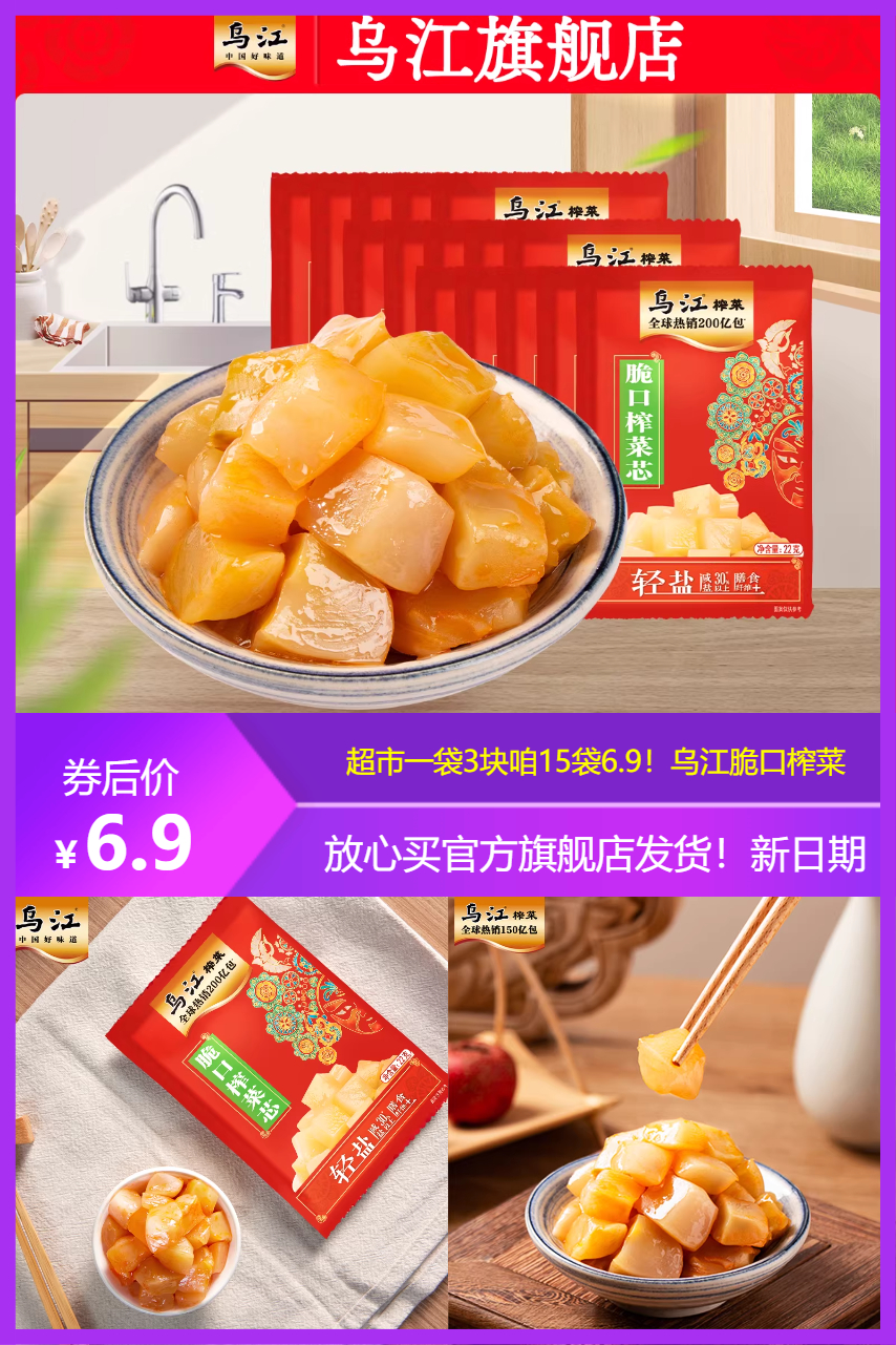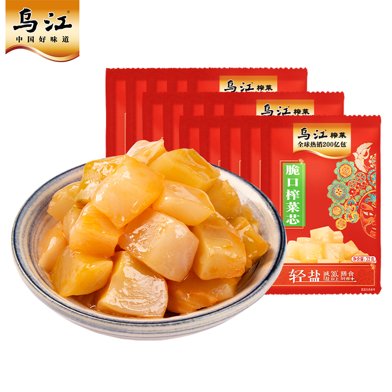 【下拉百亿补贴直播间到手6.9元】乌江脆口榨菜芯 22g*15 袋,精选涪陵青菜头,去皮去筋,非遗三腌三榨,轻盐减咸,脆嫩爽口。独立小袋便携,配粥下饭拌面都香,开袋即食,全家都爱吃,囤货必备!