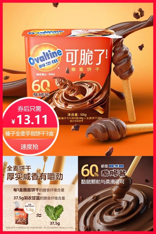 推荐:12元阿华田榛子全麦手指饼干3盒