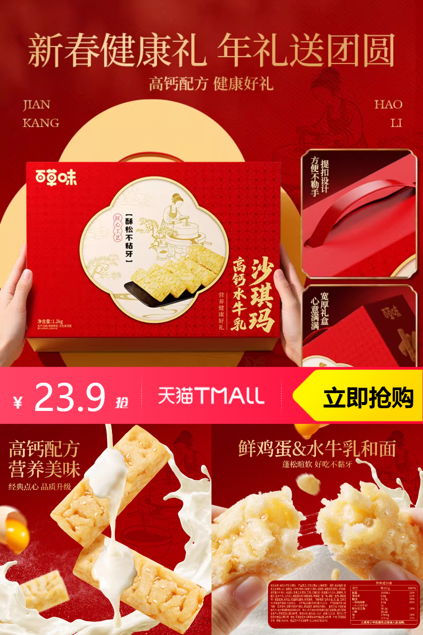 【页面价29.9元-2元百补补贴-4(下拉详情页,直播入口领专享红包)-0.29(淘金币)-2.95(消费券凑单抵扣)=20.66】百草味高钙水牛乳沙琪玛礼盒2.4斤,精选新鲜鸡蛋+低筋面粉制作,蛋香浓郁,口感酥松软糯,全家老少都爱吃。