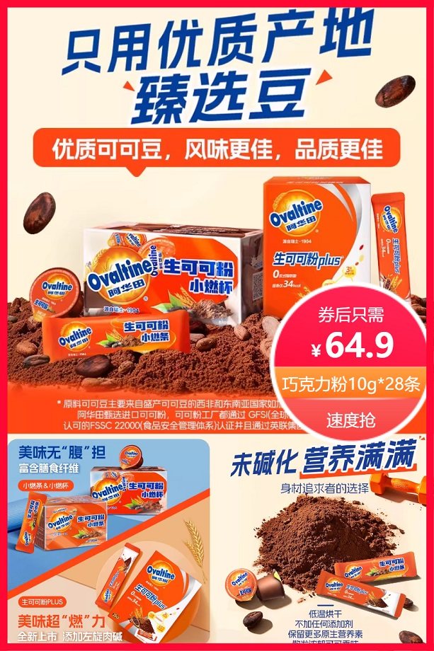 官方立减20元+券5元+88vip省3.25元+淘金币省1.79元+猫超新客立减2元后约57.86元,优质可可豆,好冲泡,真能溶!