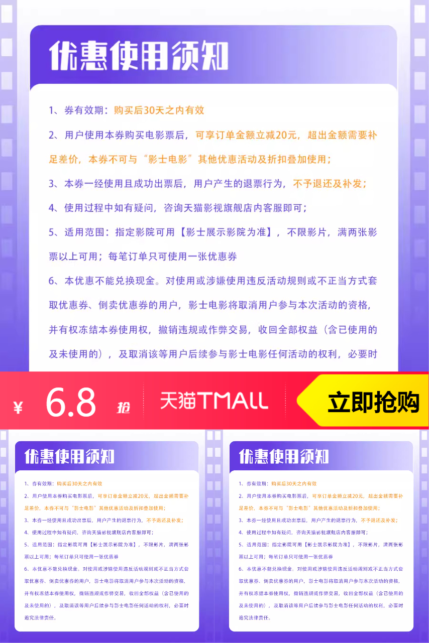 【淘金币抵扣0.06元,到手6.74元】20元电影票无门槛代金券,不只是娱乐的诱惑,更是一个全家的乐趣,你爱的电影尽在眼前!