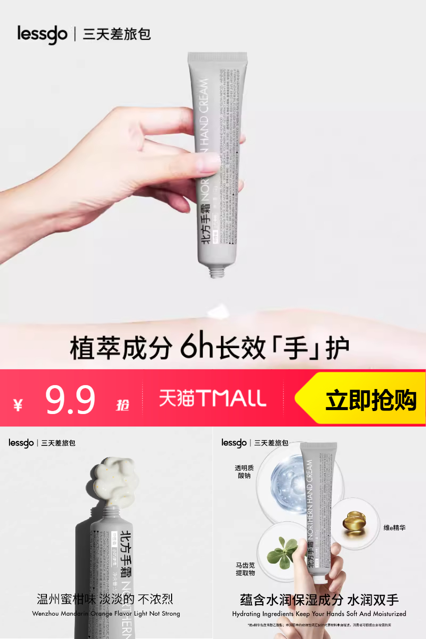 lessgo利事多北方手霜50g,专为北方寒冷干燥研发,富含多种植物精萃,能迅速渗透肌肤,形成长效锁水屏障,8小时持续保湿,小支便携设计,轻松放入口袋包包~