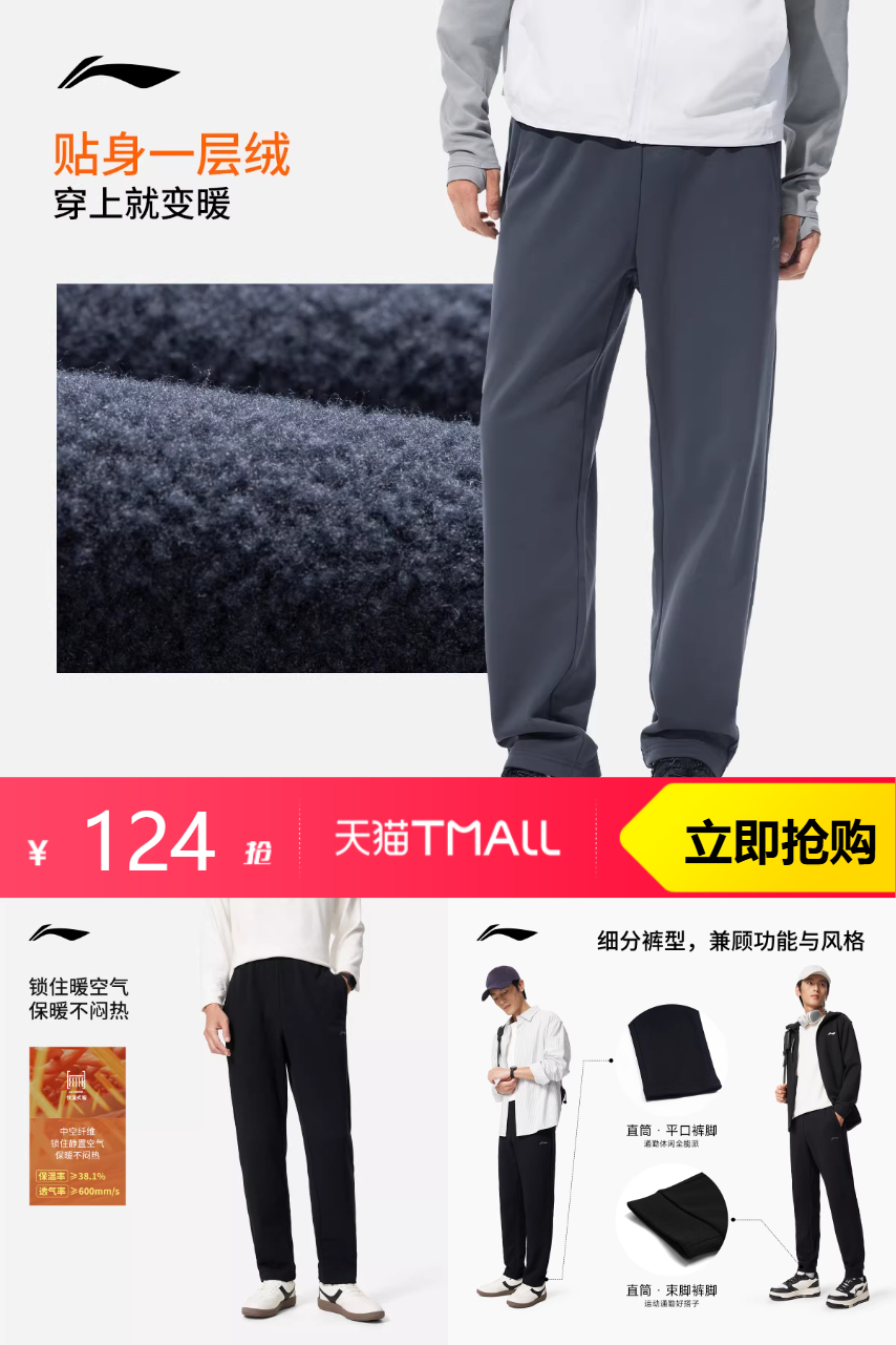 【10点开始有双倍礼金抵18,叠消费券和购物金到手68,可继续叠李宁大额券和淘金币(2.48)到手更便宜】李宁加绒热力裤 | 卫裤男士健身长裤,这款产品最显著的优势是它的高密度加绒设计,不仅能够为你的腿部提供卓越的保暖效果,而且它的贴身设计使你活动自如,不受束缚。无论是健身还是户外活动,它都能让你感到温暖而舒适。