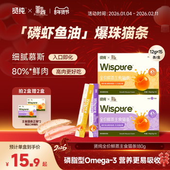 【1、单品券6元 2、拍立减14元 3、首单礼金1元 4、淘金币1.78元 最终拍猫条单盒15条装到手仅需7.12元,单条0.47元】15条!贤纯全价鲜蒸爆珠三文鱼磷虾猫条,美毛buff加成,毛发顺滑直达。