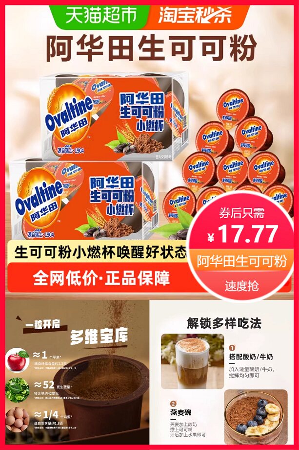 秒杀直降21元+券2元+88vip省1元+淘金币抵扣2.13元后约16.77元,叠加消费券更实惠!阿华田生可可粉天然未碱化无蔗糖生酮代餐烘焙巧克力冲饮10g*10颗