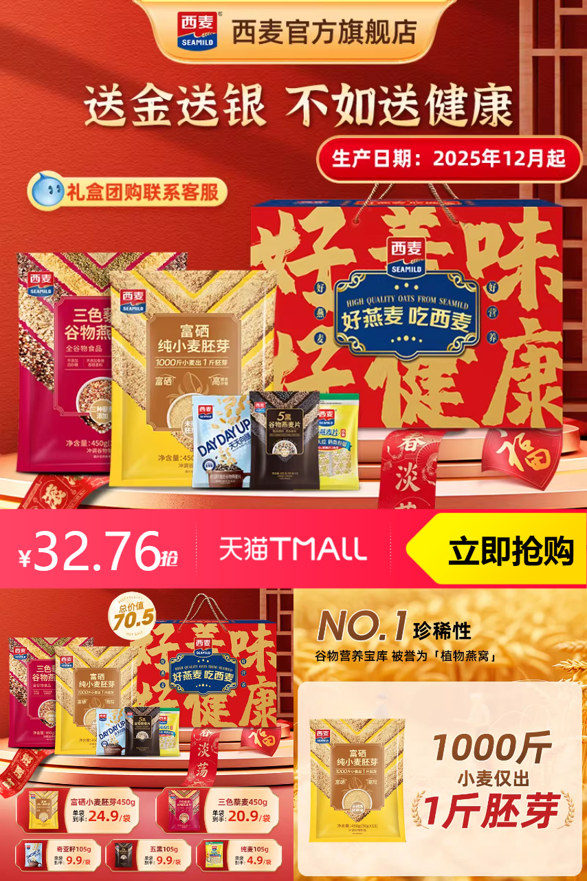 【原价59-官方补贴24.79-限时折扣1.76-淘金币0.59=32.76,叠加88vip消费卷满200-25到手价28.9】好营养好健康好燕麦好美味,富含硒的四好礼盒重磅推出。西麦4好燕麦片1215g,冲饮方便,营养早餐搭档,送礼自用都合适!礼盒装实惠划算,囤货正当时!