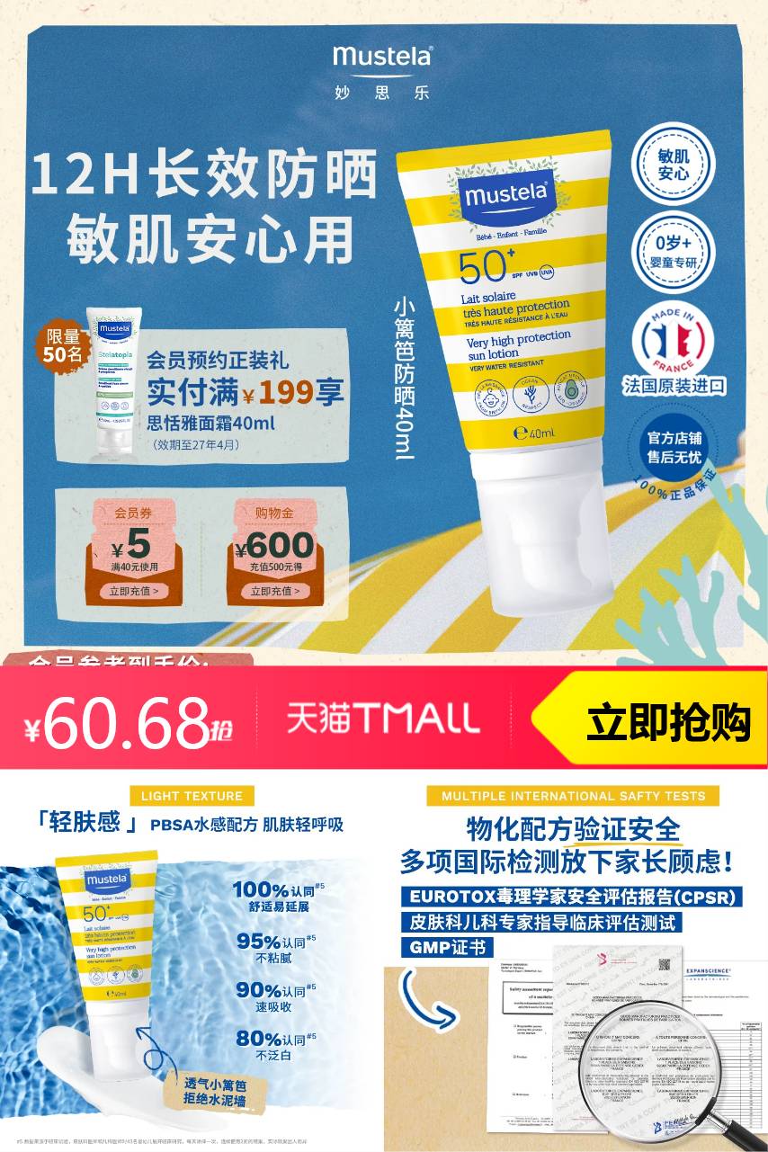【拍40ml !叠加淘金币8.87元,凑200-25消费券抵扣6.36元,限时红包3元,到手42元左右】mustela妙思乐儿童防晒霜婴儿专用,12H长效防晒,安心0负担。