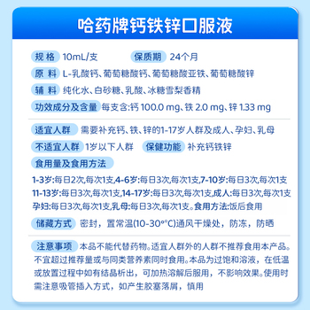 推荐:哈药牌钙铁锌口服液三精蓝瓶葡萄糖酸液体钙儿童补钙补铁锌口溶液