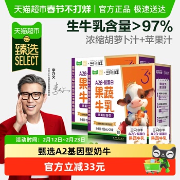 宝贝们,快来尝尝这款由演员李乃文推荐的蒙牛三只小牛A2β-酪蛋白儿童果蔬牛奶吧!富含胡萝卜汁,让小朋友喝出健康。每盒装有20盒,2箱装,送礼佳选。快来选购吧!