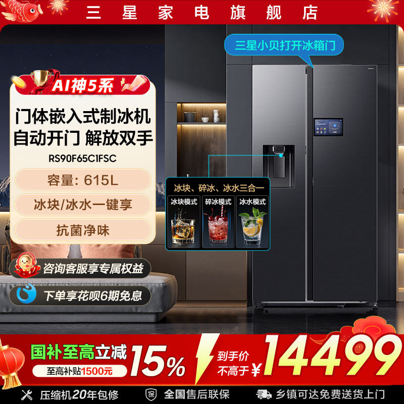 【超值优惠】您现在购买三星615L制冰机冰箱,即可享受政府补贴20%!这款冰箱采用先进的智能控制系统,不仅节能省电,还能自动控制温度,为您带来舒适的生活体验。其大容量设计适合家庭使用,满足您的日常生活需求。快来选购吧!
