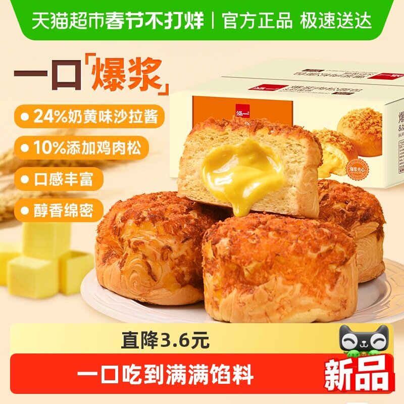 【泓一】爆浆肉松面包,奶黄口味,健康美味,适合学生、上班族及休闲时刻享用。酥软Q弹的面包内夹着浓郁的肉松和细腻的奶黄馅料,每一口都是满满的幸福感。适合作为学生早餐或休闲零食,也是午后时光的好伴侣。