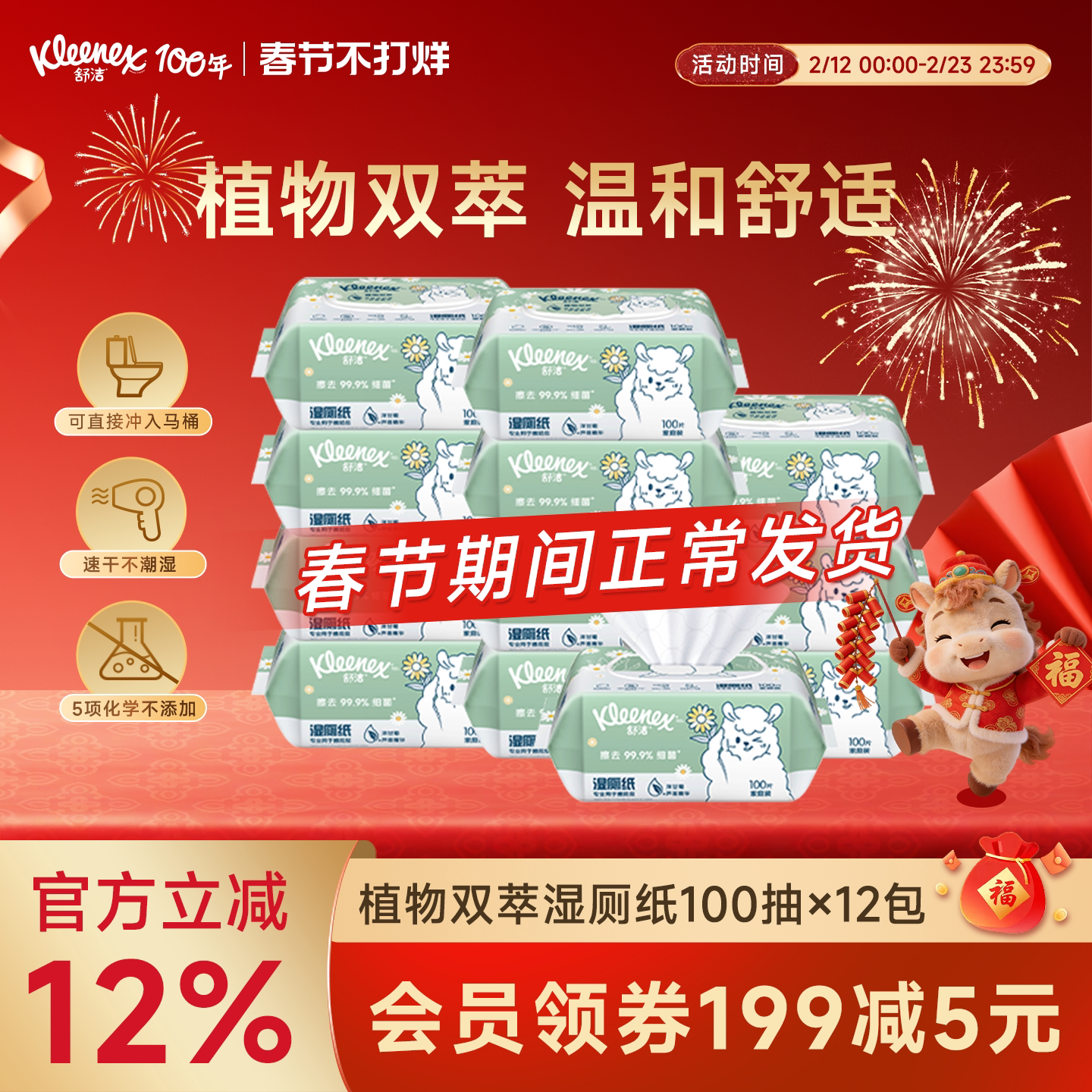推荐:舒洁植物双萃湿厕纸100抽*12包