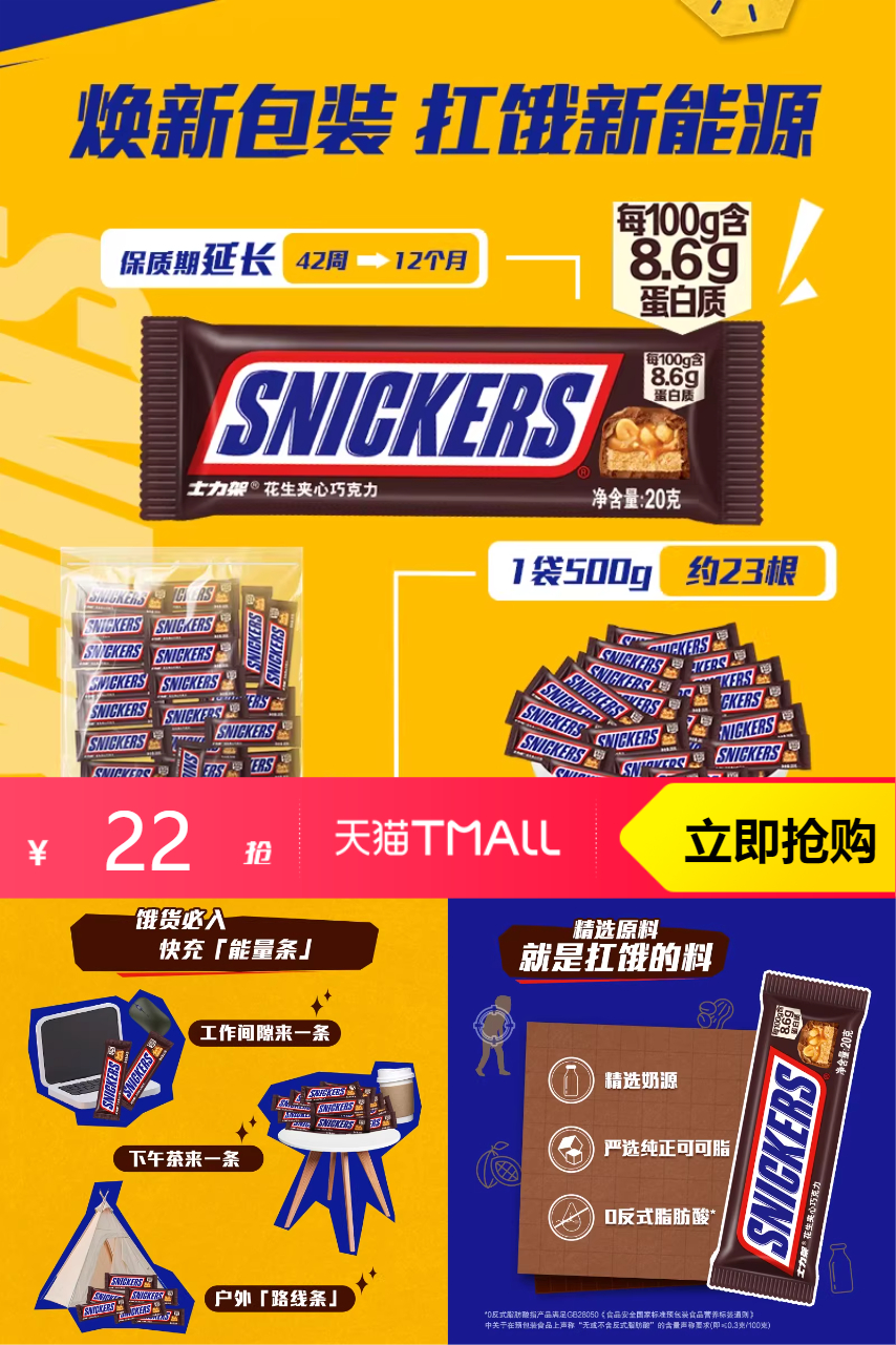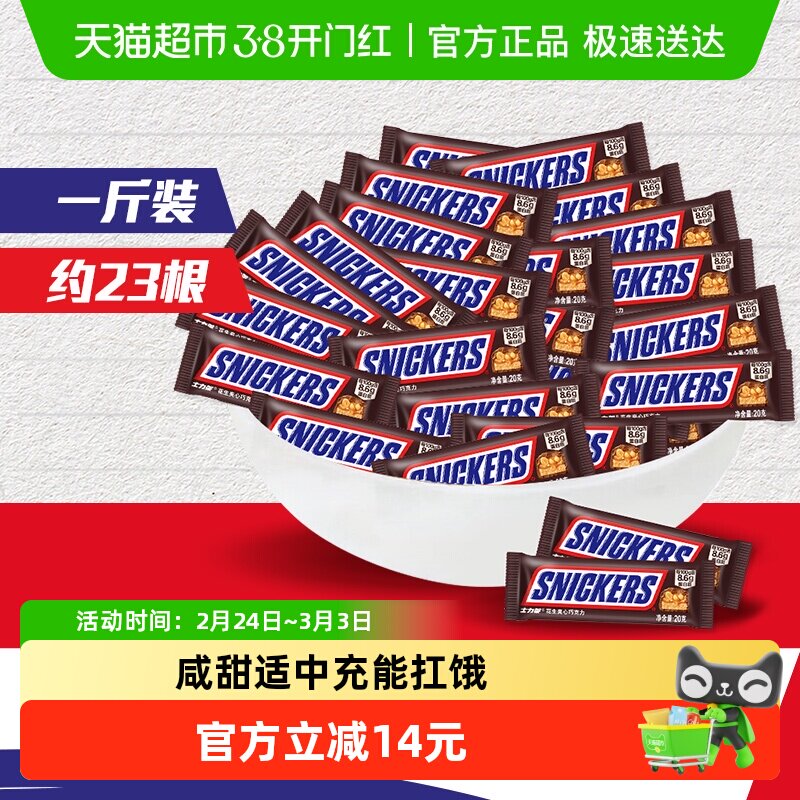 【1、价到礼金款;详情页领闪购红包3元,礼金补贴1.43,领淘金币后凑消费券到手22.5元】士力架花生夹心巧克力500g*1袋运动零食能量棒喜糖果,咸甜适中,充能扛饿。