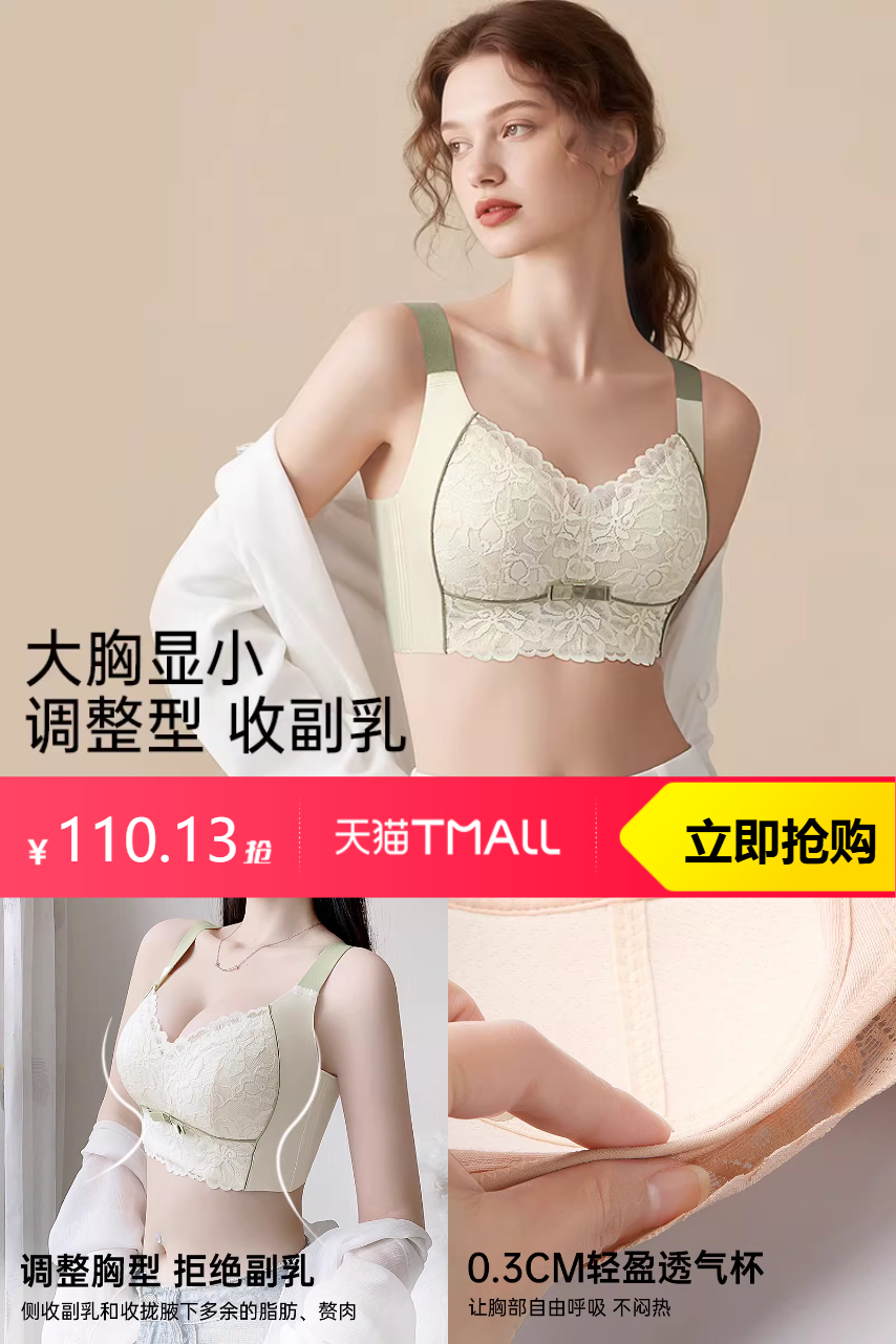 【官方补贴50,淘金币抵扣3.38,满200减25消费券减14.2,到手价101.42】润微院线调整型大胸显小蕾丝薄款内衣,全罩杯大包容显胸小,防下垂,定胸型,矫外扩。加宽侧比藏起副乳,侧收副乳和收拢腋下多余的脂肪、赘肉,快来试试吧!