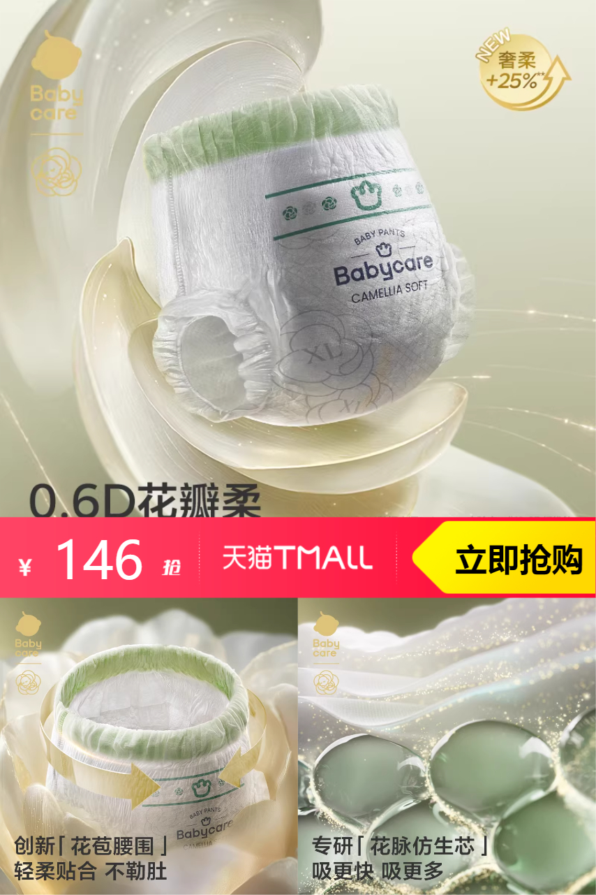 【88vip95折可优惠7.3,满200减25消费券可优惠17.21,到手价121.49】babycare金山茶花纸尿裤3包,创新[花苞腰围」,轻柔贴合不勒肚。