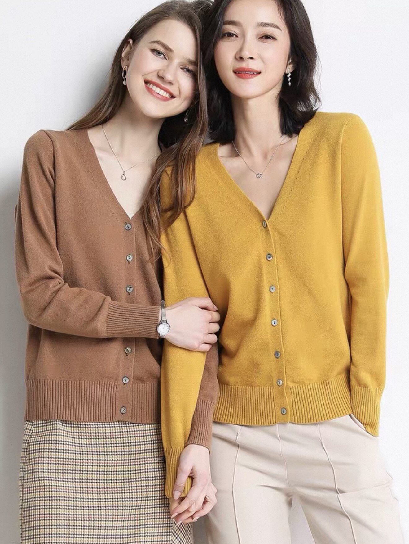 推荐:极简风开衫V领针织衫女绿色长袖打底衫宽松舒适