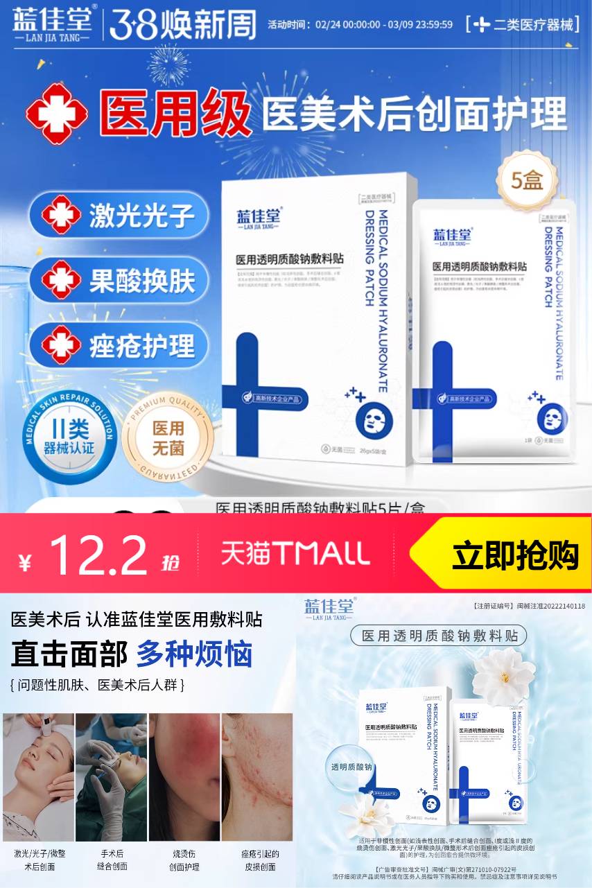 【淘金币5.06,到手价7.14,不到1.2一片,还赠医用洗面奶一支】蓝佳堂敷料贴含有丰富的透明质酸钠,它就像一个“水光瓶”,为你的肌肤注入源源不断的水分。每次使用后,你都会感到肌肤仿佛喝饱了水,光滑而富有弹性。
