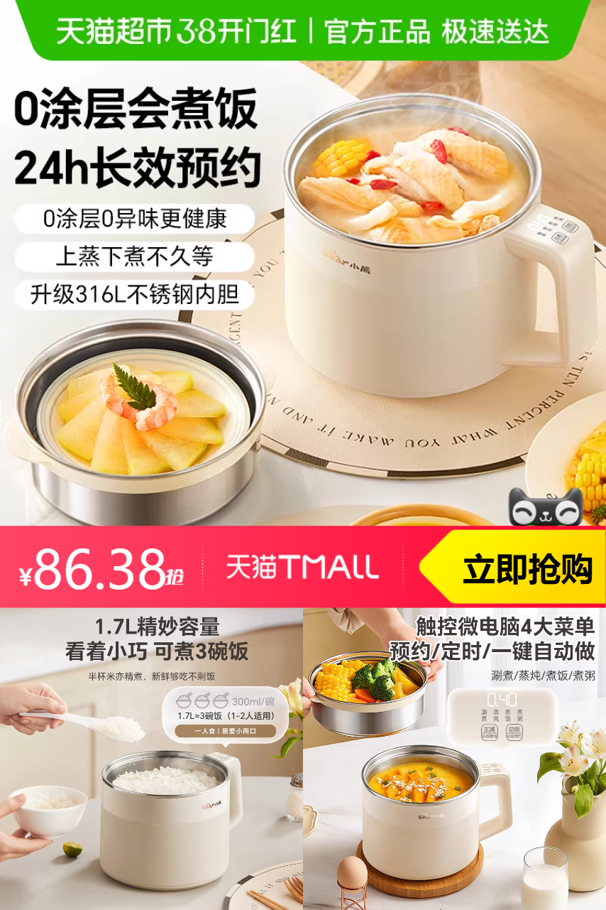 【官方立减50,,10元类目券,88VIP减6.95,淘金币抵扣15.92,满200减25消费券减14.51,地补15.24,好p猫卡5元,到手价81.38】小熊电煮锅不锈钢小型多功能电饭煲,品质优选。