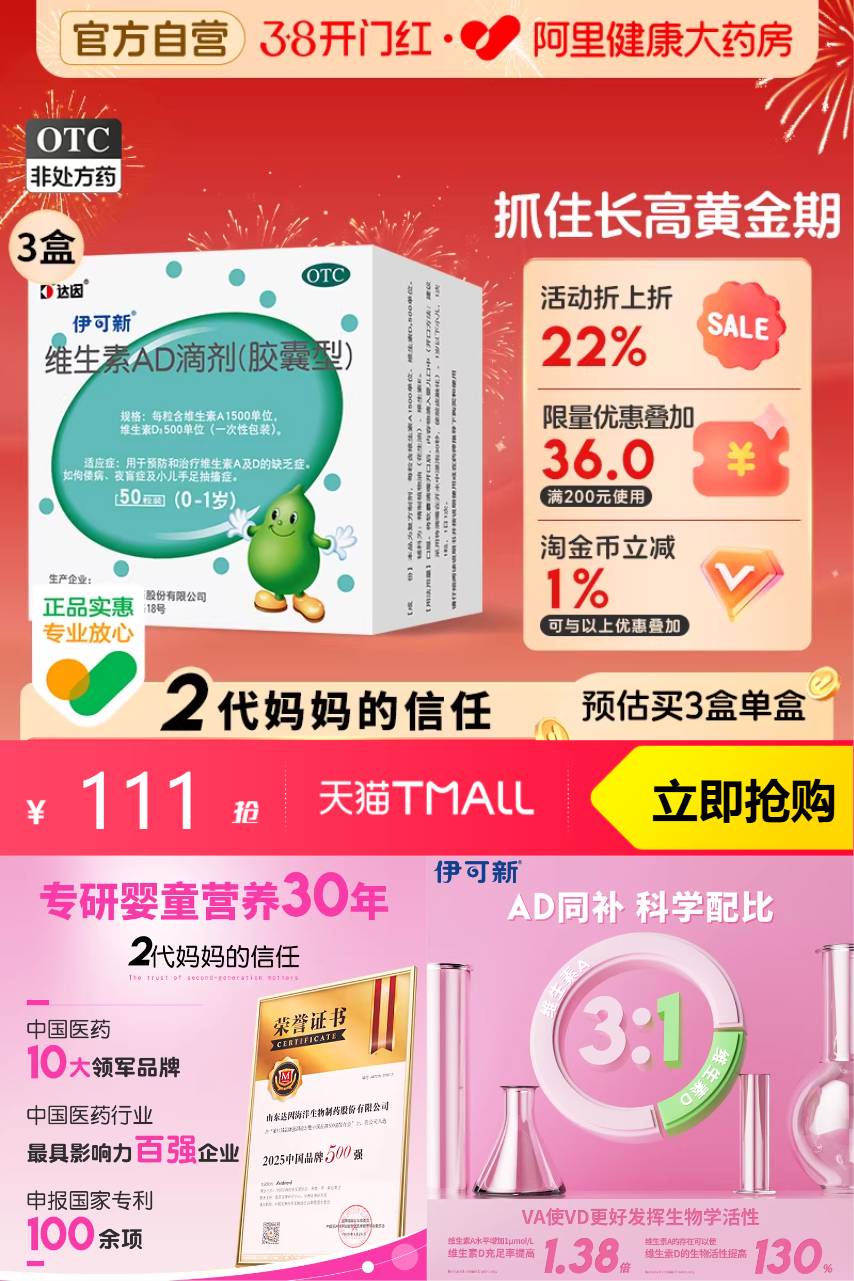 【叠加官方限时补贴11元+阿里药房购物券10元+淘金币18元+凑消费券200-25=到手仅需63元。合计单粒/0.42元】!!伊可新维生素AD滴剂,0-1岁以上达因维生素A佝偻病夜盲小儿手足抽搐