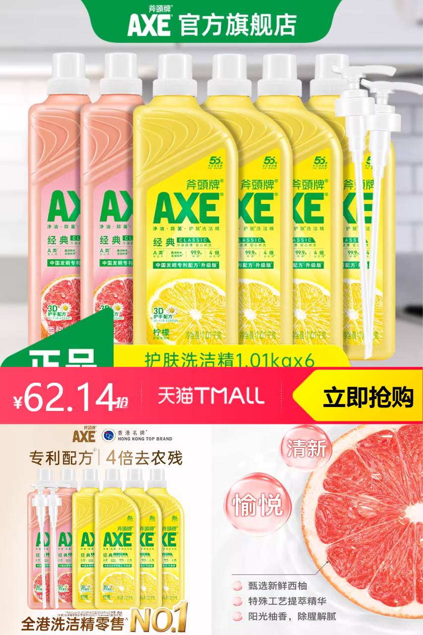 【官方立减27,淘金币抵扣1.99,满200减25消费券减8.77,到手价62.14】AXE斧头牌洗洁精家用整箱6瓶,洁净升级冷油重油轻松除,晶洁纳米去油技术,火锅大餐不油你!