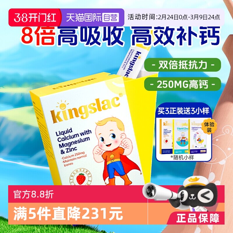 【天猫国际】KINGSLAC可维思婴幼儿钙镁锌补钙液态钙,采用科学配比,提供的营养支持。适合3岁以上儿童饮用,帮助孩子健康成长。轻松添加到日常饮食中,补充钙、镁、锌等多种矿物质,有效预防骨质疏松,促进骨骼发育。每一瓶都是高品质,安全。妈妈们可以放心为宝贝选择。