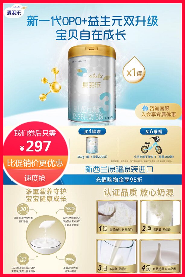 【立减88元,淘金币抵12元,到手285元,充值购物金享95折更划算】单罐900g,新一代OPO+,添加近30种维生素和矿物质,9:1臻优配比益生元,营养全能,双核守护。小肚肚舒适,欢畅一整天。