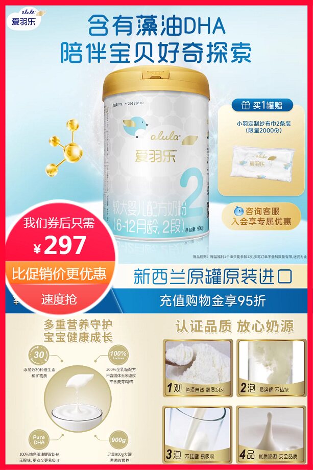 推荐:爱羽乐较大婴儿配方牛奶粉2段900g