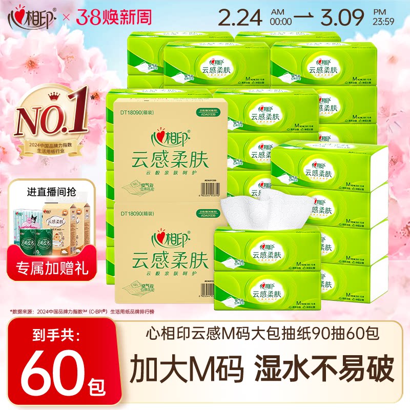 推荐:心相印纸抽纸巾整箱云感M码90抽实惠装家用大餐巾纸卫生纸面巾纸