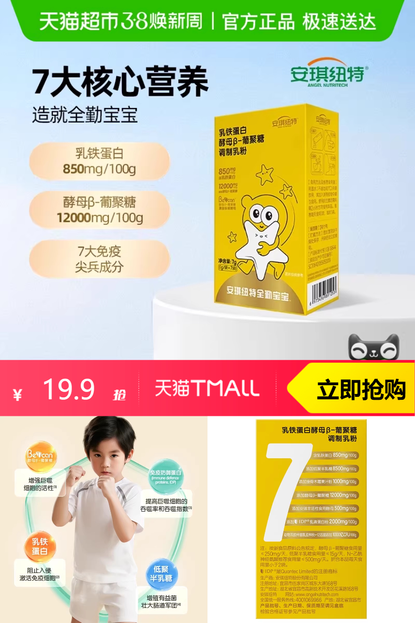 【原价29.9-官方立减10-88vip减0.95-淘金币0.4=到手17.65,凑消费券到手15.9元左右】安琪纽特全勤宝宝乳铁蛋白葡聚糖1g*7,品质优选。