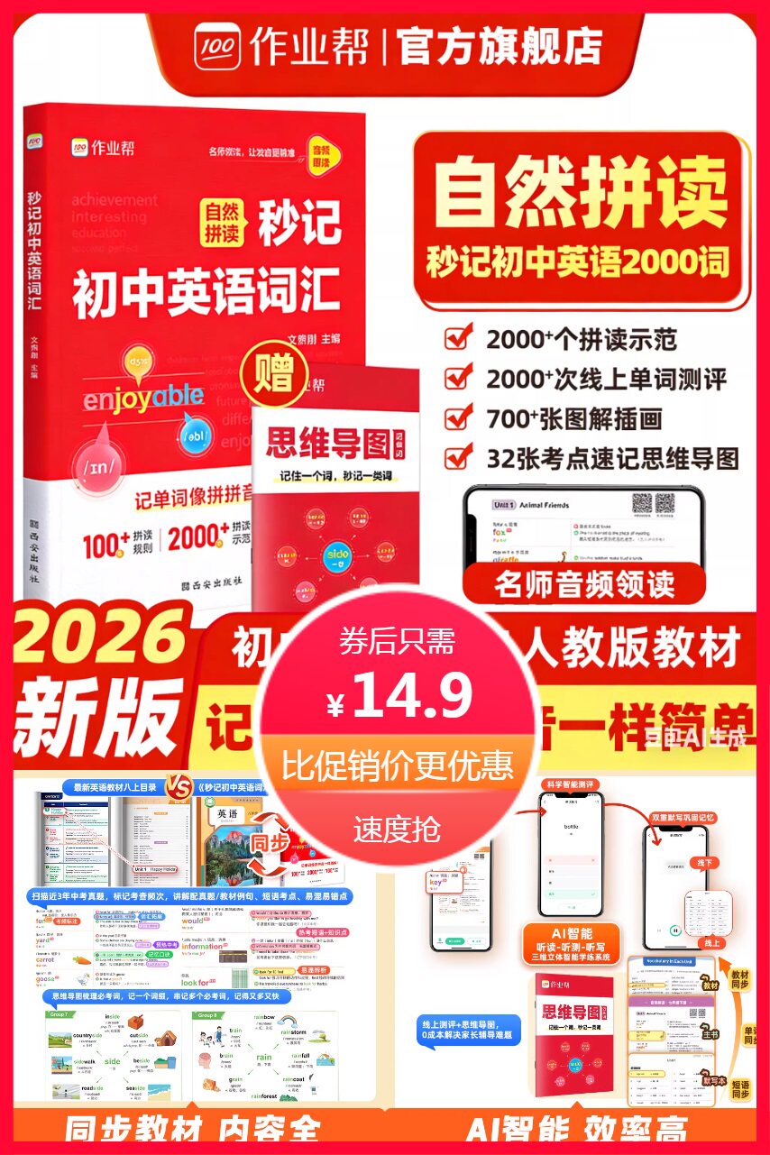 作业帮秒记初中英语词汇!人教版必背2000词全覆盖,自然拼读+联想记忆+中考真题例句,背得快、记得牢、用得准~同步教材、科学分级、便携开本,省下补习班费用,自学提分更高效!