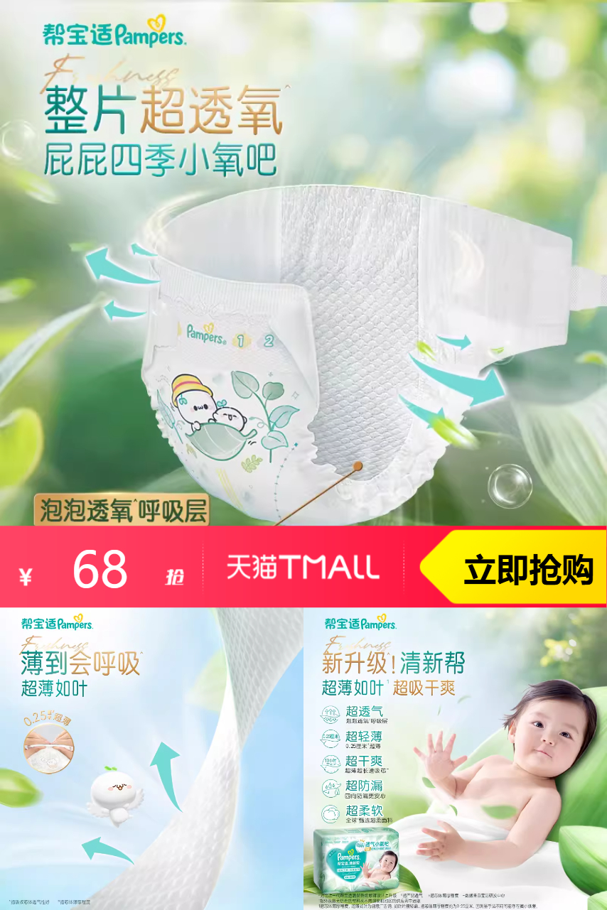 【原价95元-超级立减27=券后价68,叠加1.85元淘金币+红包7元+品牌立减10元+88vip=到手价47.03,到手0.7元/片】帮宝适新升级清新帮纸尿裤66片,专研64年,眼见为实的安全感!新升级!清新帮超薄如叶,超吸干爽!整片超透氧,屁屁四季小氧吧,快来试试吧!
