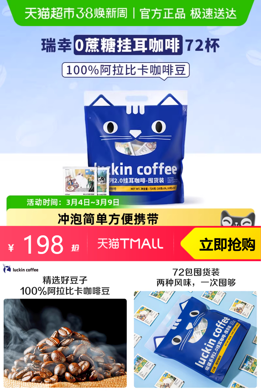 推荐:瑞幸挂耳咖啡吸猫美式10g*72袋囤货装