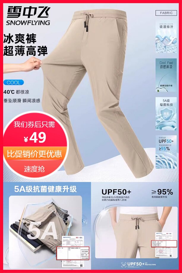 ⭕雪中飞男抗菌凉感冰丝裤速干直筒休闲裤